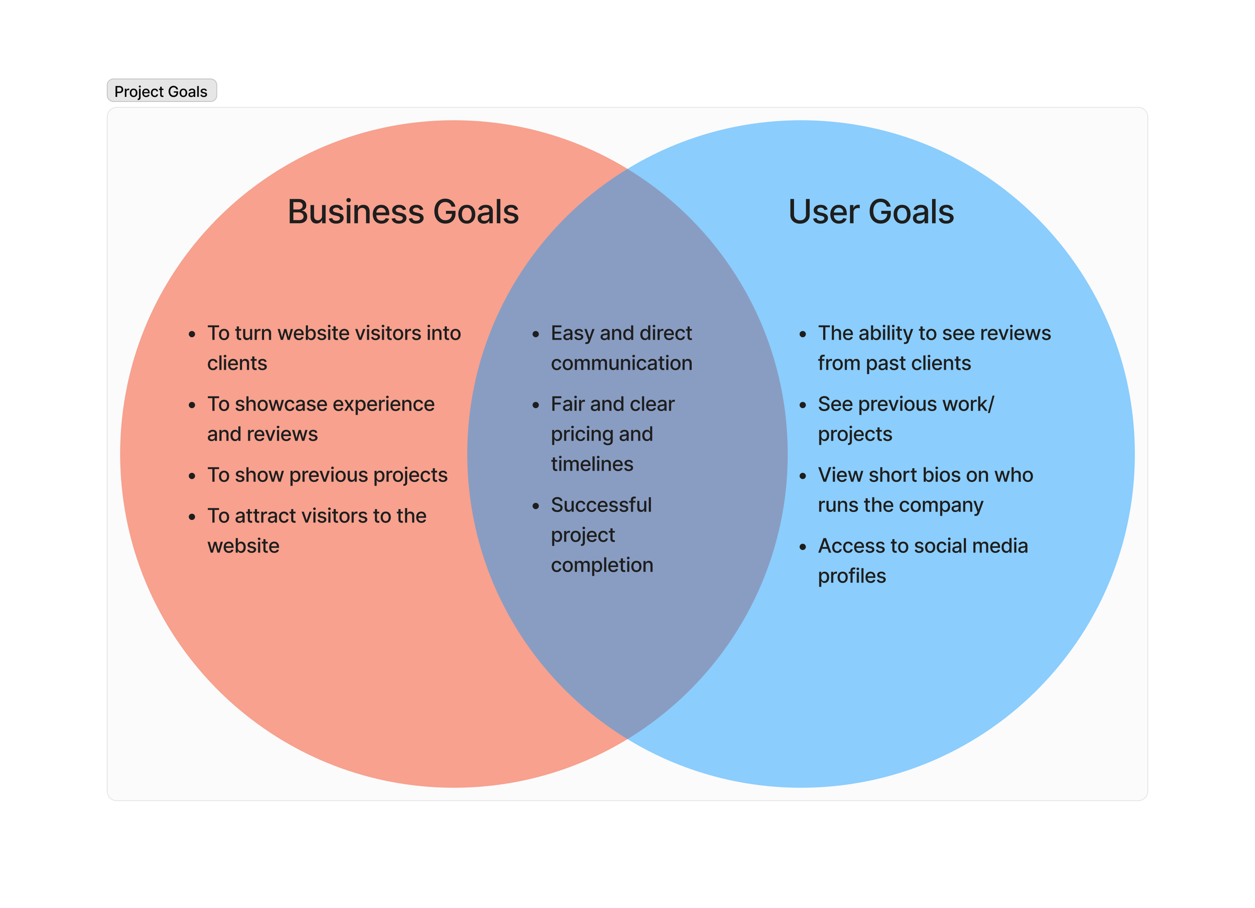 In order to create project goals which meet both user and business needs and goals, I created a Venn diagram to better conceptualize where this project would be heading in the design phase.