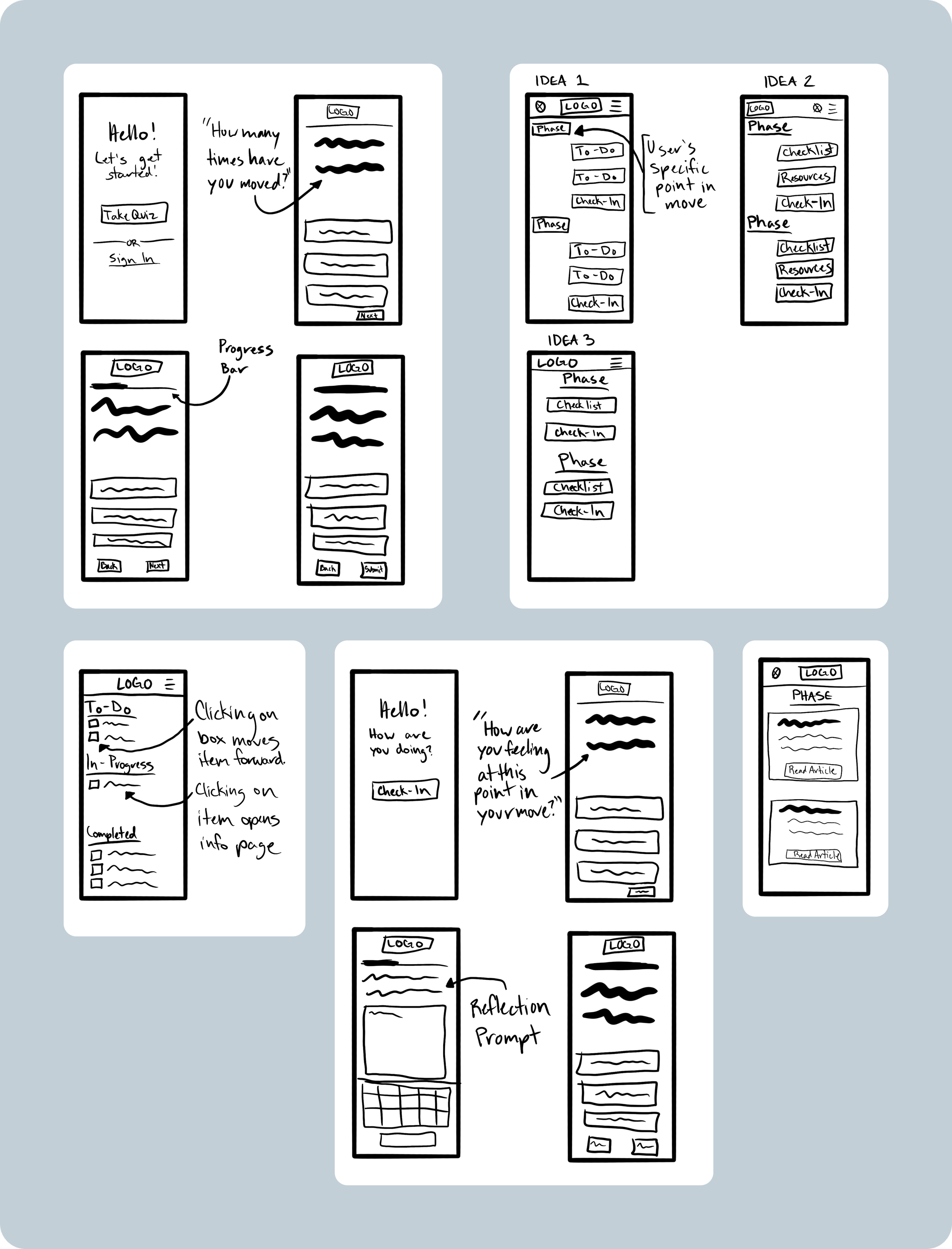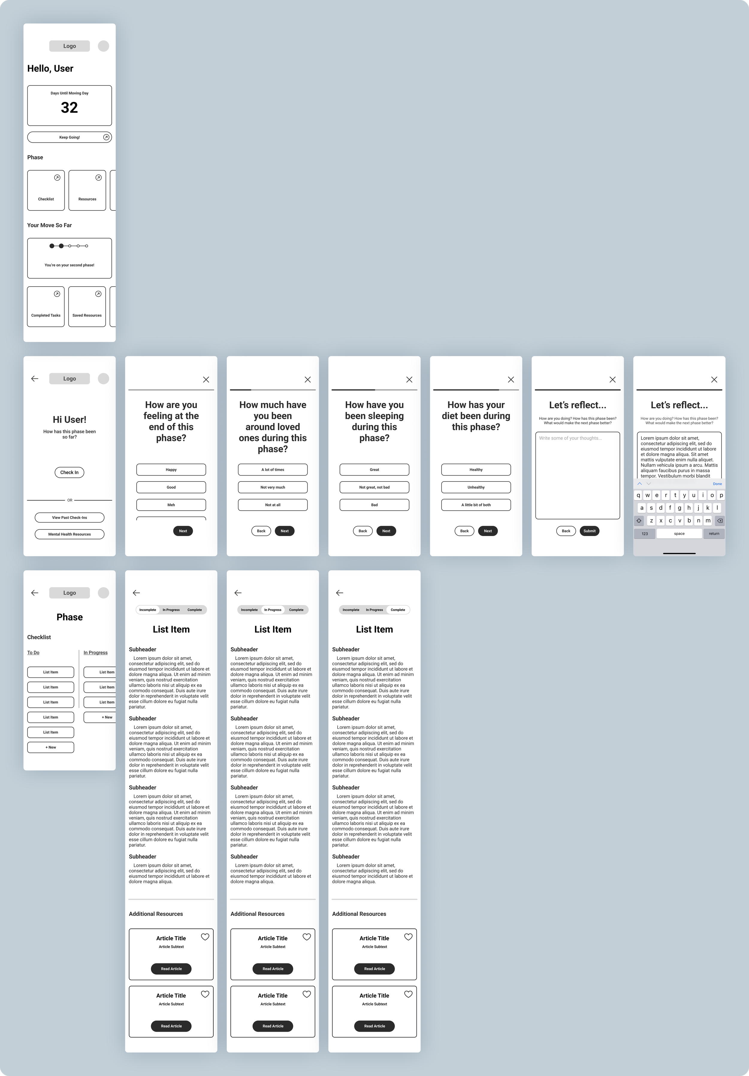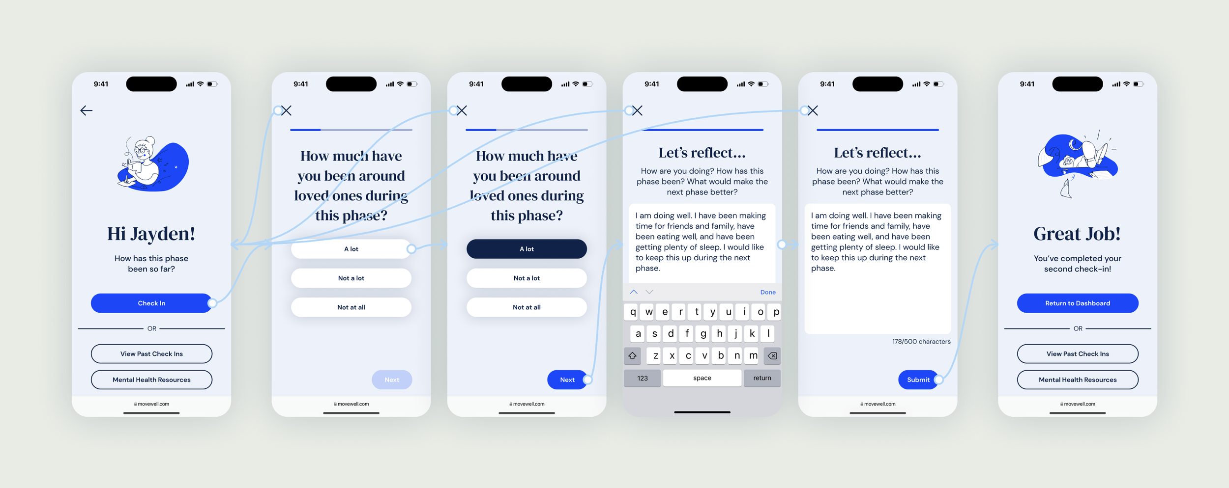 The second feature which which needed to be prototyped was the check-in flow. This feature allows users to identify specific emotions and patterns experienced during each specific phase of their move, and then reflect on specific those experiences.