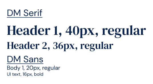 When choosing a typeface, I wanted to communicate a sense of trustworthiness, simplicity, and calmness, just like the colors. I chose DM Serif and DM Sans, which are from the same family but allow for more ornate headers and simple, easy to read body and component text.
